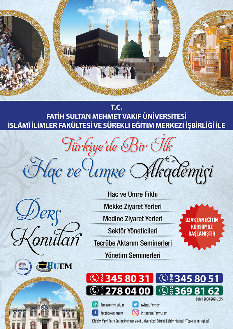Fatih Sultan Mehmet Vakıf Üniversitesi İslami İlimler Fakültesi, Sürekli Eğitim Merkezi ve Hac Umre Eğitim Merkezi işbirliği ile 1 Haziran 2015’te başlatacağı Hac Umre Akademisi Uzaktan Eğitim Programı ile Türkiye’de bir ilke imza atıyor. Üniversite bünyesinde hazırlanan ve tur sektörü firma yöneticilerinin deneyimleriyle zenginleştirilen eğitime, Hac ve Umre ibadetlerinin farizalarını detaylı olarak öğrenmek isteyen herkes katılım gösterebilir. Uzaktan eğitim yöntemlerinin kullanılacağı programda, Mekke ve Medine’deki iklim koşullarına bağlı olarak sağlık açısından dikkat edilmesi gereken hususlar da uzman doktor tarafından verilecek sağlık eğitimiyle aktarılacak. Eğitimi alan kişiler tur firmalarında rehberlik yapma imkanı elde edebilecek. Hac ve Umre sektöründe hizmet veren rehberler ise bu eğitim sayesinde yetkinliklerini artırma fırsatı bulacaklar.