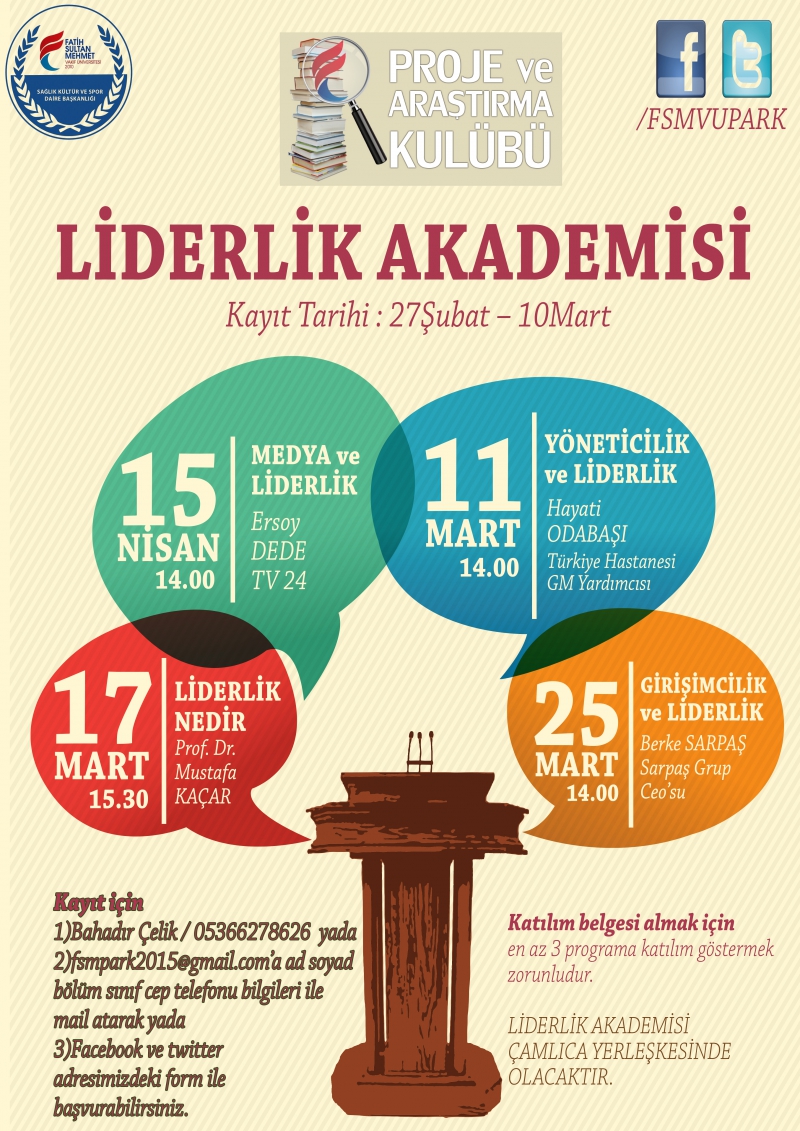 Küçük Çamlıca yerleşkesinde gerçekleşecek olan Liderlik Akademisi kayıtları 27 Şubat itibari ile başlamıştır. Öğrencilerimizden yüksek katılım beklediğimiz programa 10 Mart tarihine kadar başvurabilirsiniz.